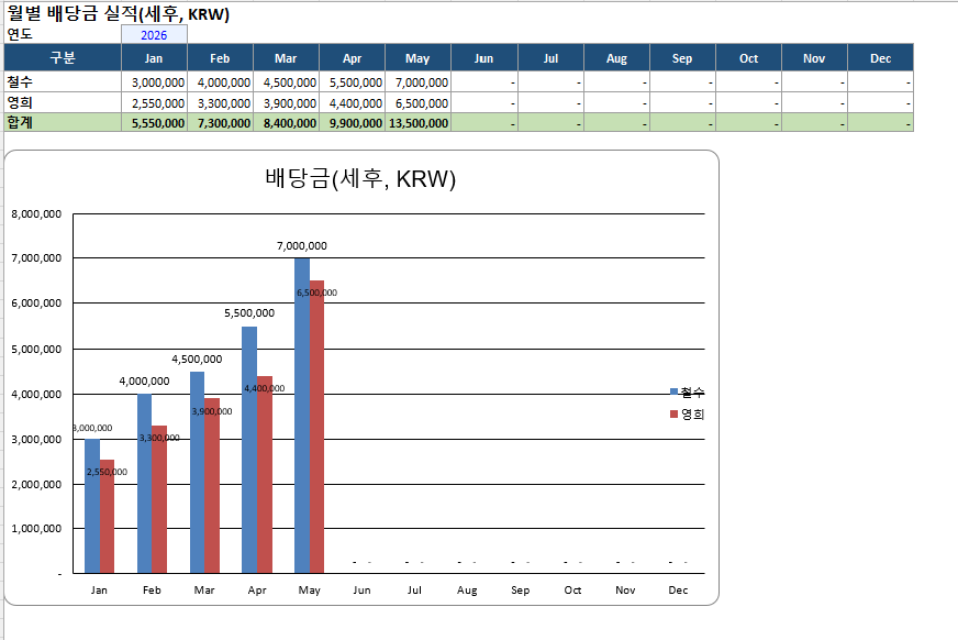 - **배당금(세후)**과 추가 투자금, 배당 재투자를 한 번에 정리하고 싶은 분