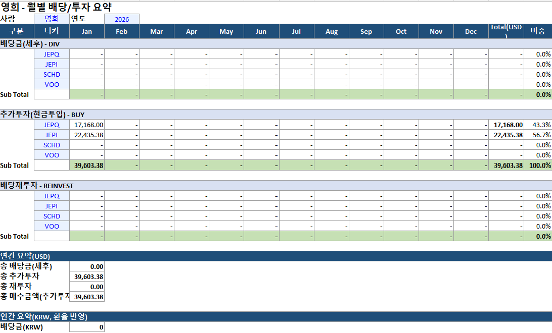 거래내역만 입력하면 월별/연간으로 배당금(세후), 추가 투자, 배당금 재투자가 자동으로 집계되게 구성했어요.