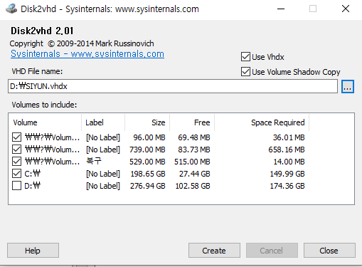 Microsoft의 개발자가 개발한 Disk2vhd 를 실행 통해 vhd로 변환하는 방법이 있다.