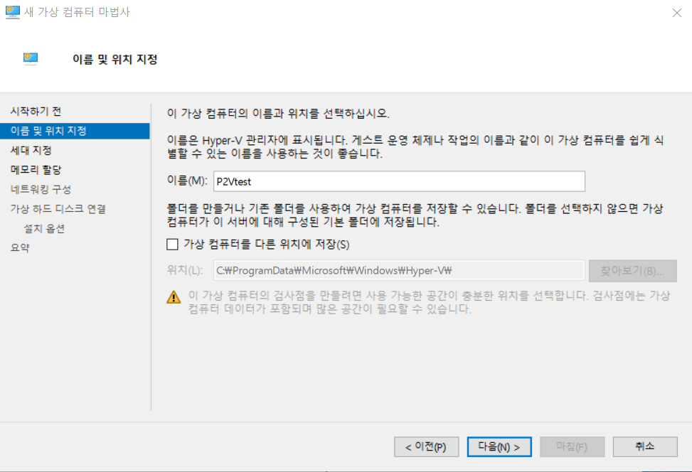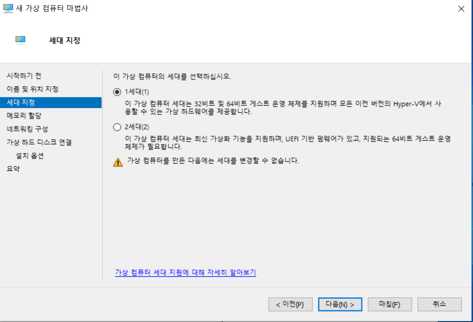 1) Hyper-V 관리자 -> 동작 -> 새로만들기 -> 가상컴퓨터