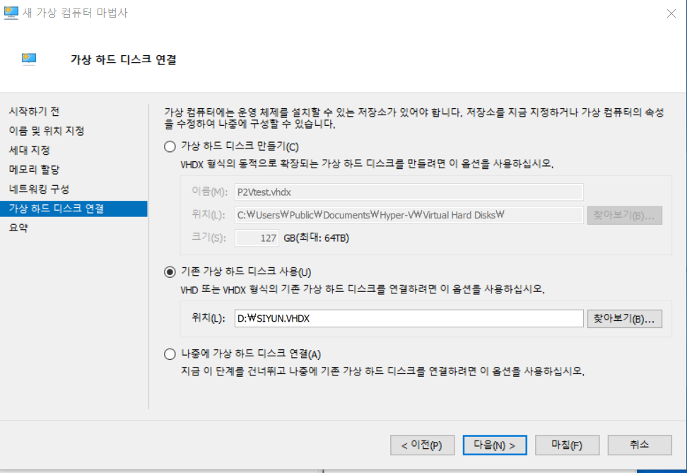 가상 하드디스크 연결항목에서 방금 전에 생성한 vhd 또는 vhdx를 선택한다.
