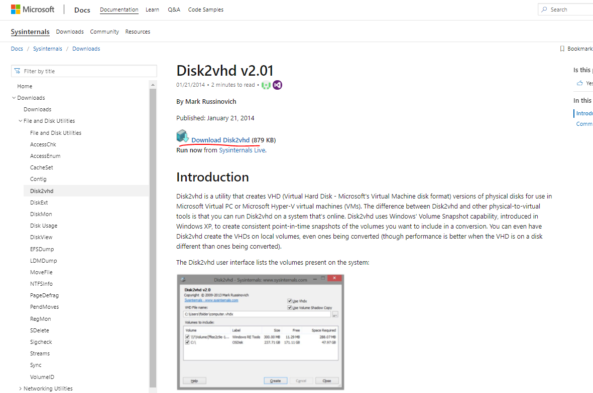 다운로드 링크 : docs.microsoft.com/en-us/sysinternals/downloads/disk2vhd